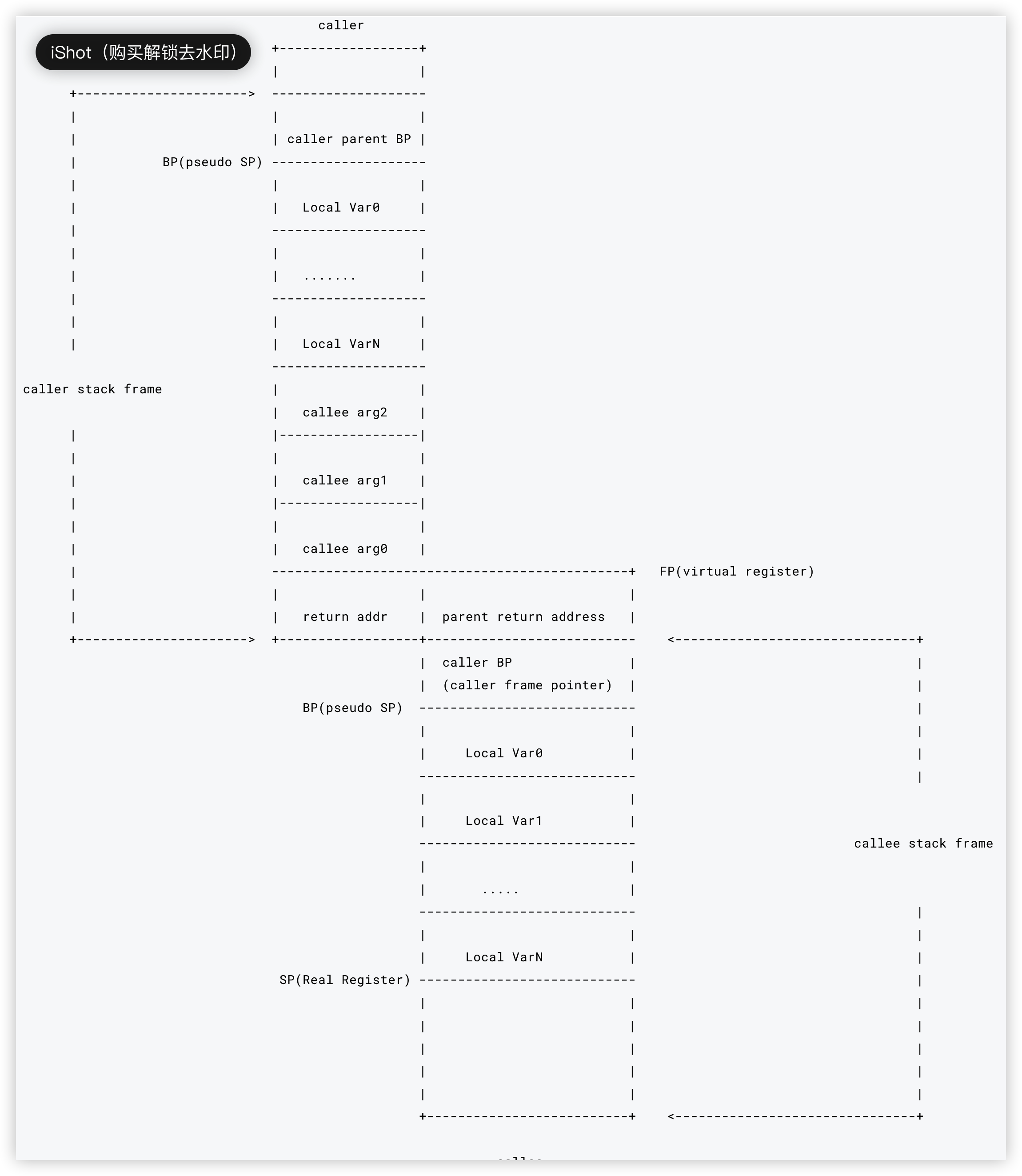 FP 和 Go 的官方源代码里的 framepointer 不是一回事,源代码里的 framepointer 指的是 caller BP 寄存器的值,在这里和 caller 的伪 SP 是值是相等的。